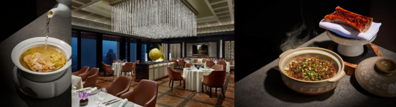 海口威斯汀酒店中国元素中餐厅的儋州沙虫生蚝汤、中国元素中餐厅、西安浐灞艾美酒店乐美中餐厅的云南炊锅糊辣黑山羊