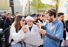品尝区的热气与香气早已溢出围挡,刚出锅的空心挂面搭配秘制地道酸汤和羊肉臊子汤底,顺滑口感让排队食客赞不绝口。浓郁的香味也吸引来了不少路过的外国游客驻足,纷纷加入吃面的队伍中,吃面的过程中还学了一句咱们西安的地道方言:嘹咋咧!“咥面大赛” 的哨声响起时,现场氛围达到顶峰,参赛者狼吞虎咽的模样与观众的加油声交织,获胜者捧着 “挂面大王” 奖牌与特产礼包,成就感溢于言表。