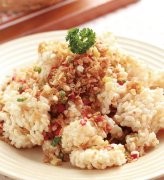 椒盐鱼下巴是什么地方的菜,椒盐鱼下巴,椒盐锅巴 【材料】 锅巴6片 葱3根 蒜仁6粒 红辣椒2根 红葱酥20公克 【调 味 料】 椒盐粉1/2茶匙 【做法】 1.锅巴剥小块。葱、蒜仁及红辣椒切碎备用。 2.热锅,倒入约500cc沙拉油(材料外),