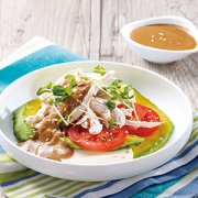 九品芝麻仙,芝麻酱拌豆腐食蔬 【材料】 嫩豆腐1盒 红番茄1颗 酪梨100公克 鸡胸肉80公克 炒过白芝麻少许 豌豆苗少许 【调 味 料】 香浓芝麻酱适量 【做法】 1.嫩豆腐切块;红番茄切片;酪梨去皮切片备用。 2.鸡胸肉入锅?烫至熟,