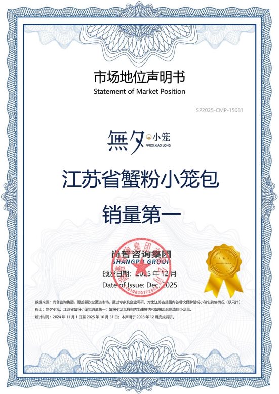 市场地位声明:無夕小笼, 江苏省蟹粉小笼包销量第一