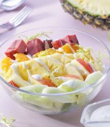 水果沙拉乐队,水果百汇沙拉 【材料】 香瓜1颗 凤梨200公克 芒果1颗 苹果1颗 火腿肉块100公克 萝美生菜叶适量 优格沙拉酱: 优格50公克 美奶滋20公克 柠檬汁15㏄ 【做法】 1.火腿肉块放入锅中煎熟,分切小块状备用。 2.香瓜、凤梨和