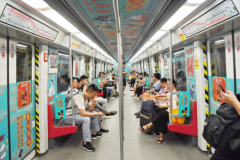 近日在广州乘坐地铁二号线的乘客们惊奇地发现:在进入车厢的瞬间,他们仿佛是穿越到了另一个次元:某次江湖“武林大赛”现场。 地铁车厢的车身四周、车厢顶都被风味江湖“承包”,每个部分既可以单独形成画面,也可以连在一起